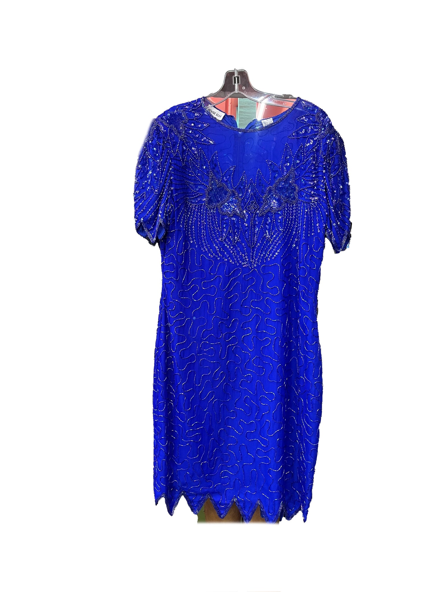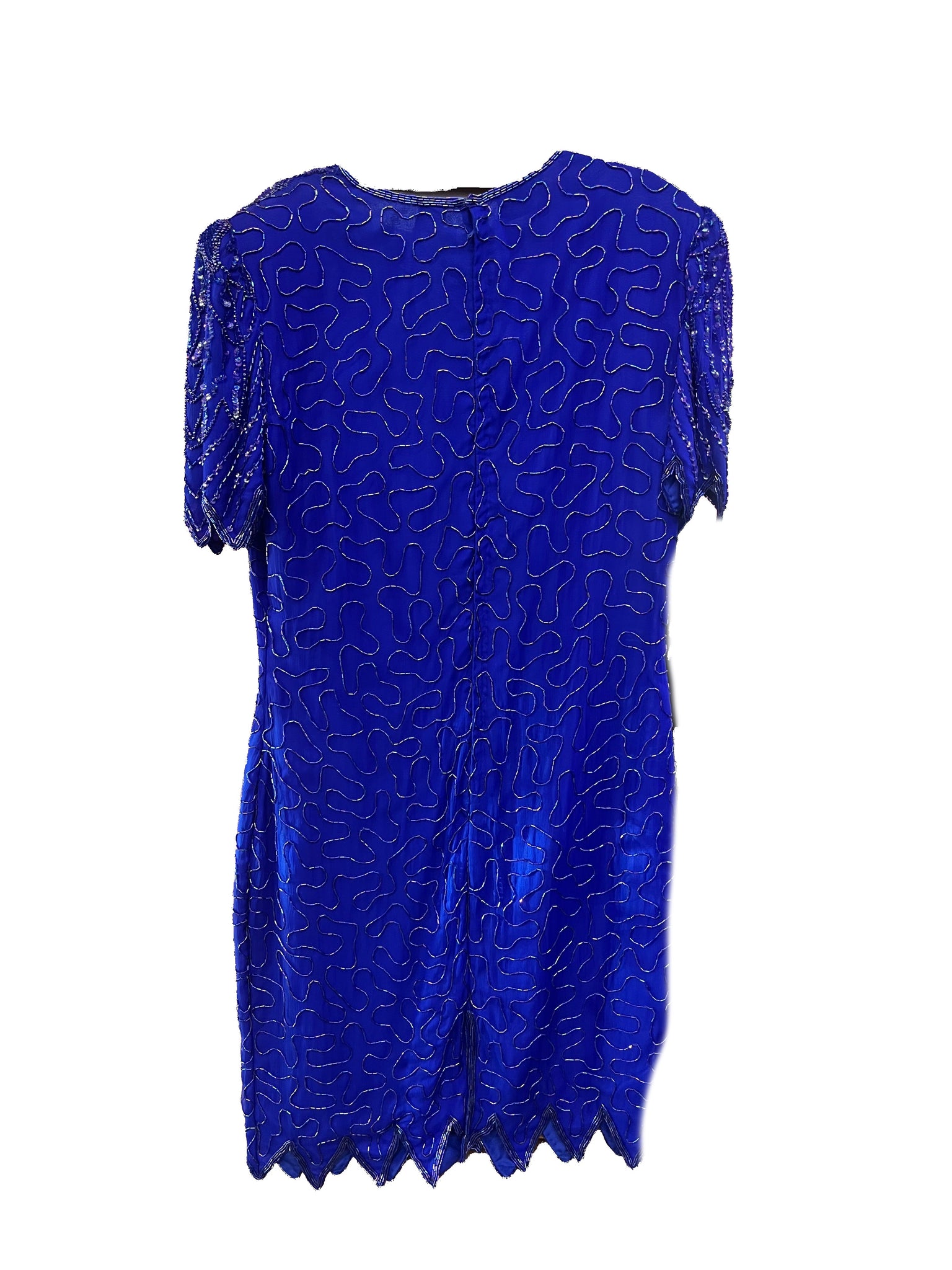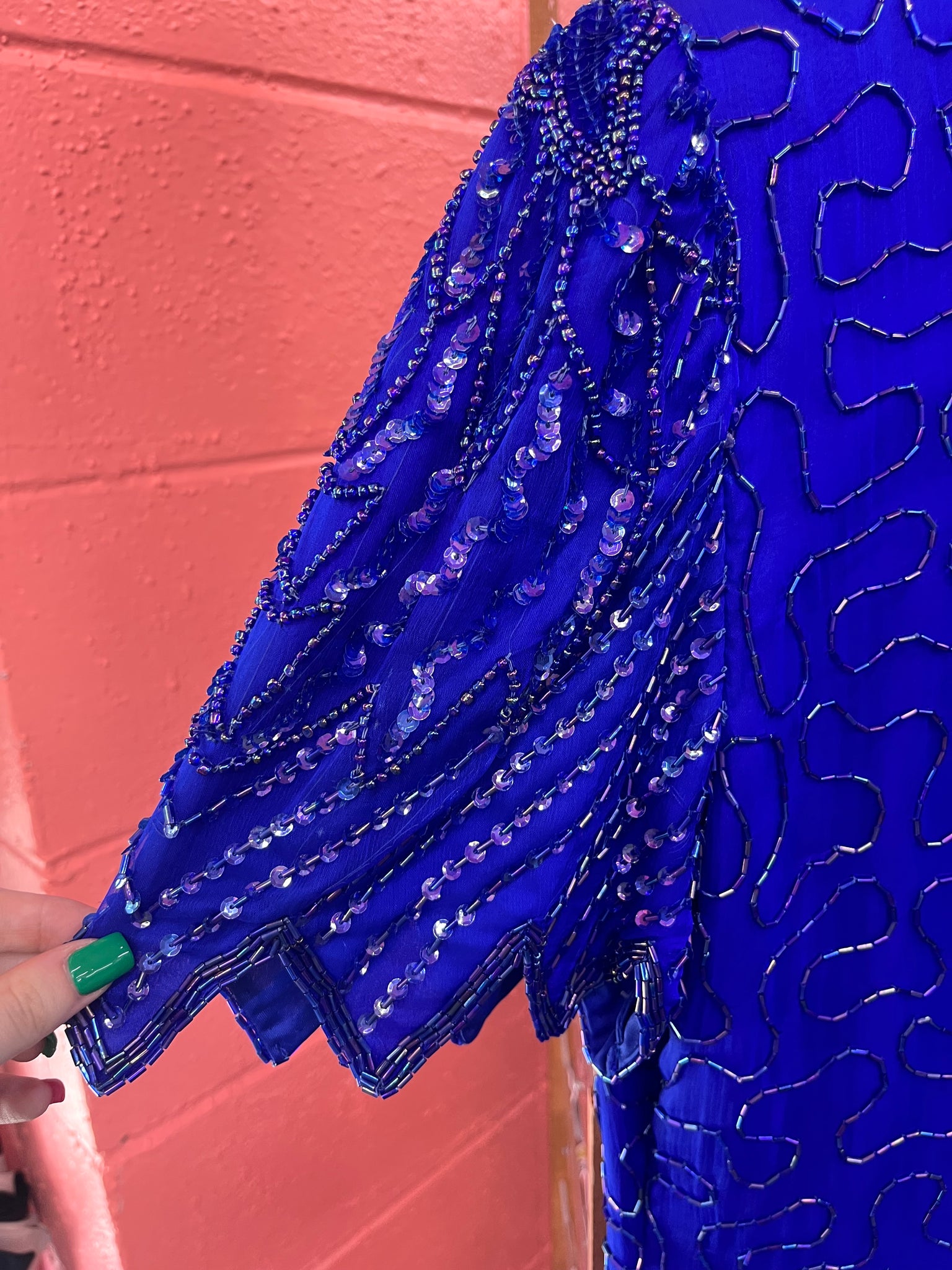 Royal blue, 100% silk beaded and sequined dress with short sleeves and a keyhole back.