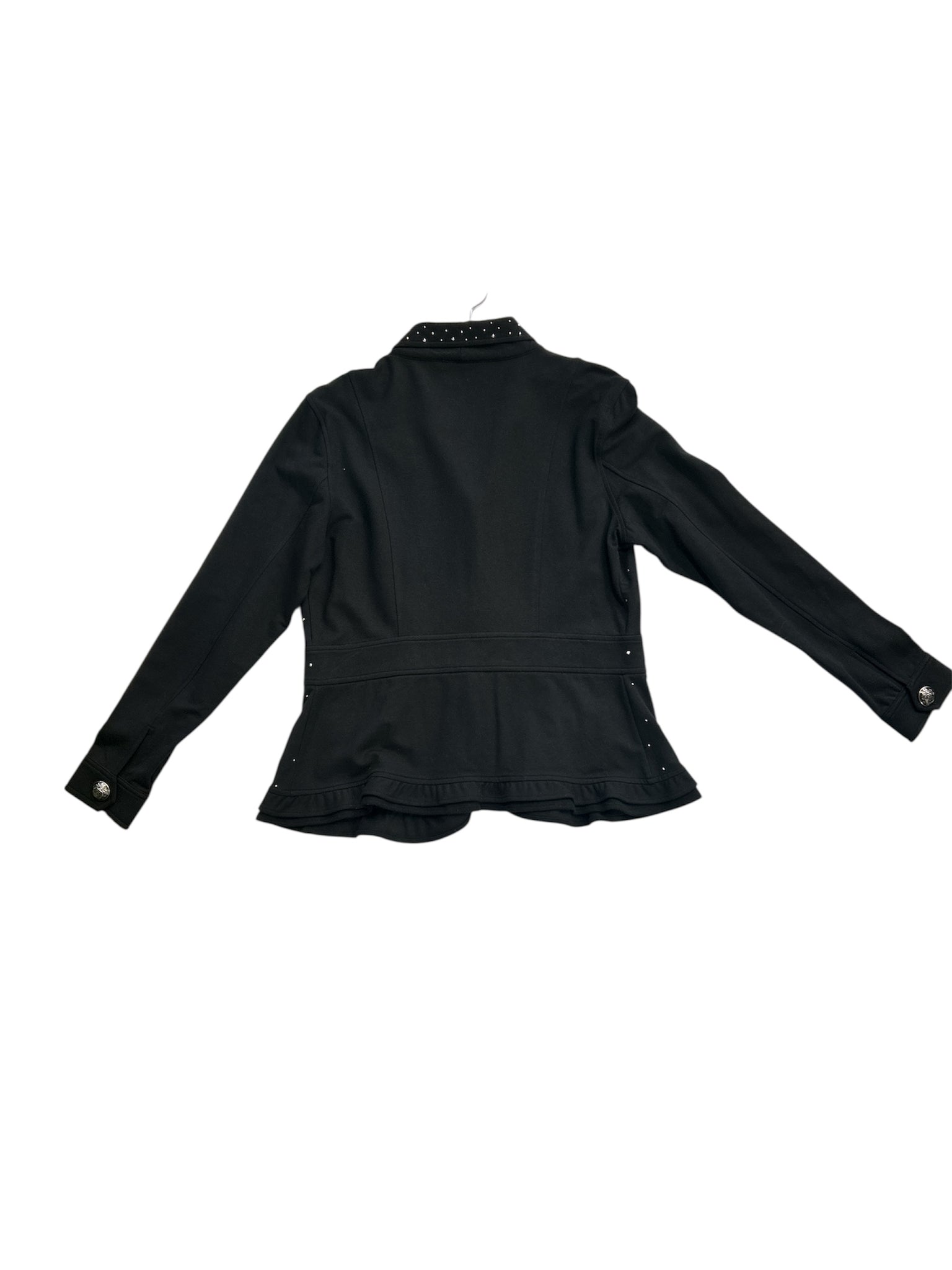 This black Christine Alexander coat features a chic, tailored design with sparkling embellishments on the shoulders and upper chest. It has a notched collar, front pockets, and a tie-front detail, making it a stylish and versatile piece perfect for elevating any outfit.