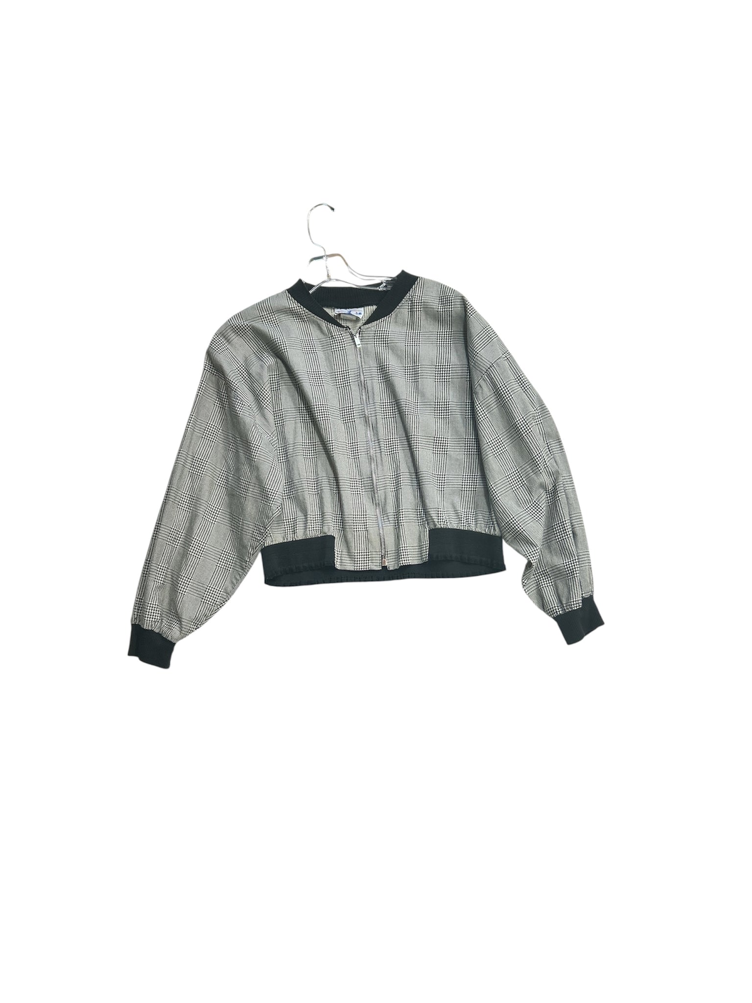 Vintage Cindy Collins oversized jacket with a relaxed fit, featuring a subtle check pattern, black accents at the collar and cuffs, and a comfortable, casual style. Perfect for adding a vintage touch to your wardrobe.