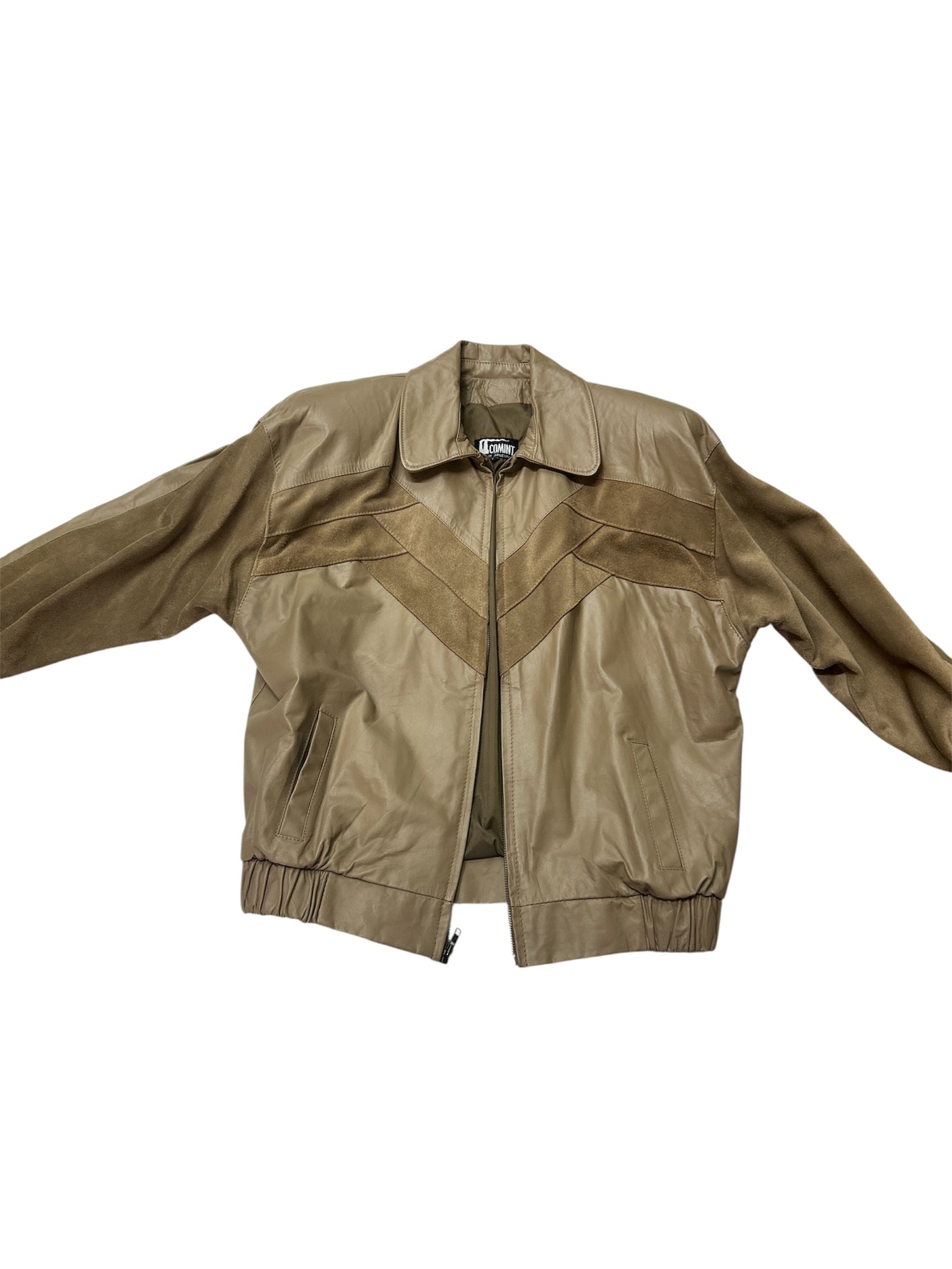 Channel vintage Western vibes with this rare Comint leather bomber jacket, featuring a two-tone tan design with suede and smooth leather paneling.