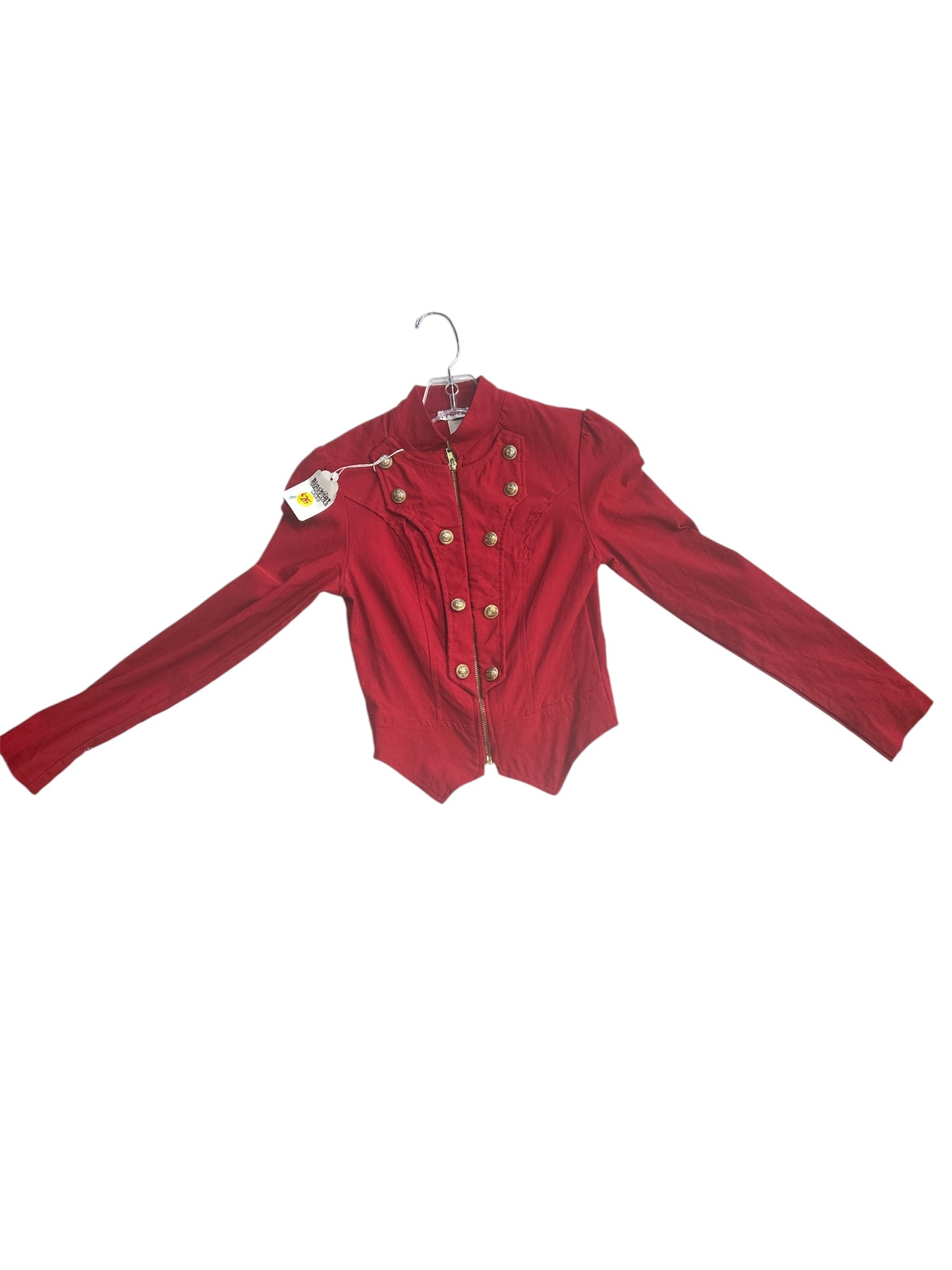 Vintage red jacket with gold buttons and a military-inspired design. Structured and stylish, perfect for adding retro flair to any outfit.